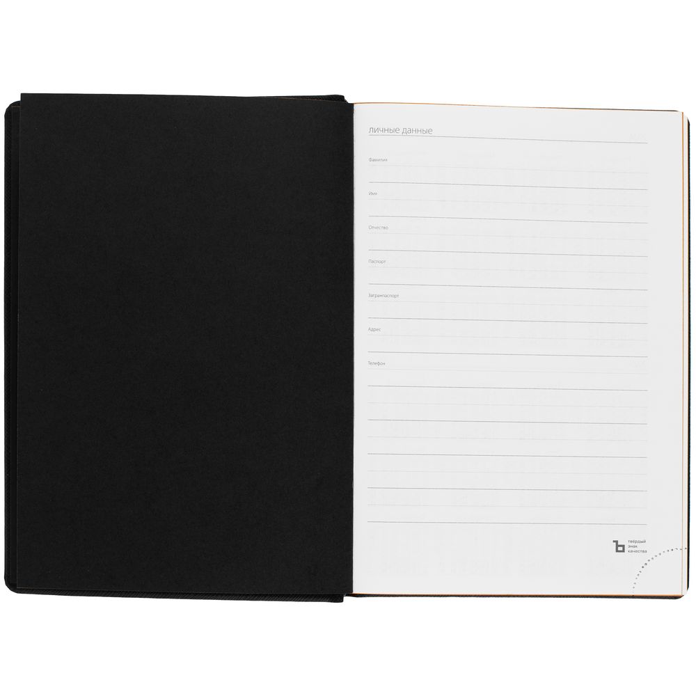 Твердая обложка выполнена из материалов Nice Touch, черный АА, и Canyon, оранжевый ОО. Ежедневник дополнен капталом, резинкой для ручки и ляссе черного цвета.