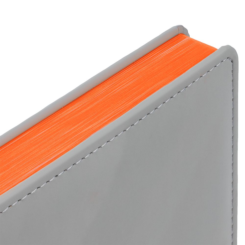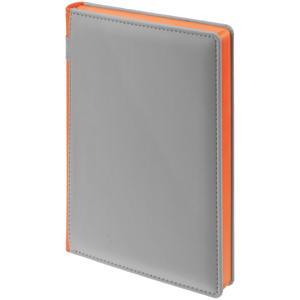 Твердая обложка с поролоном, материал обложки — Soft Touch, серый СС и Soft Touch, оранжевый ОО. На корешке ежедневника находится петля из резинки.