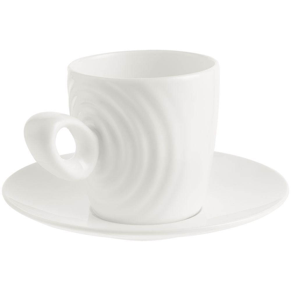 Форма сервиза создана в скульптурной технике: фарфор словно запечатлел сам момент движения. Необычная ручка предметов символизирует камень, от которого появляются завораживающие круги на воде — корпусе изделия.