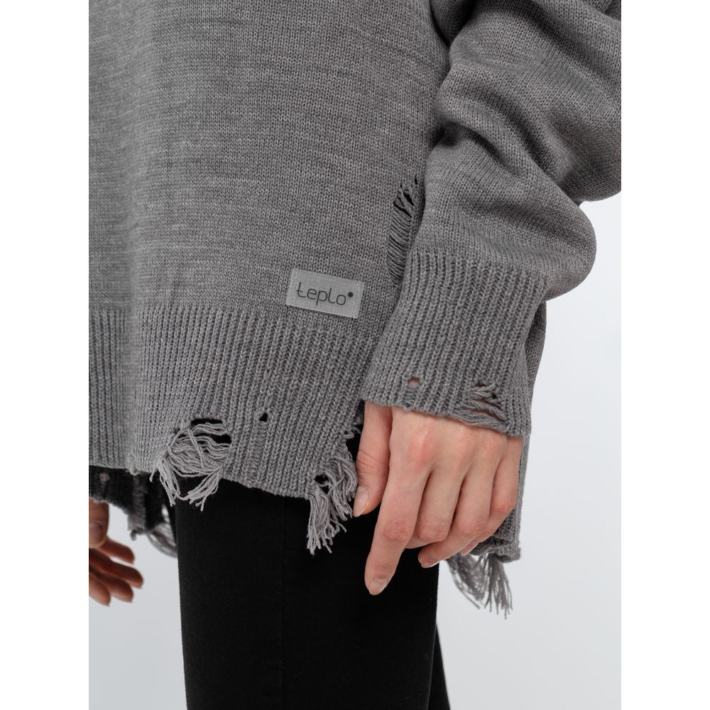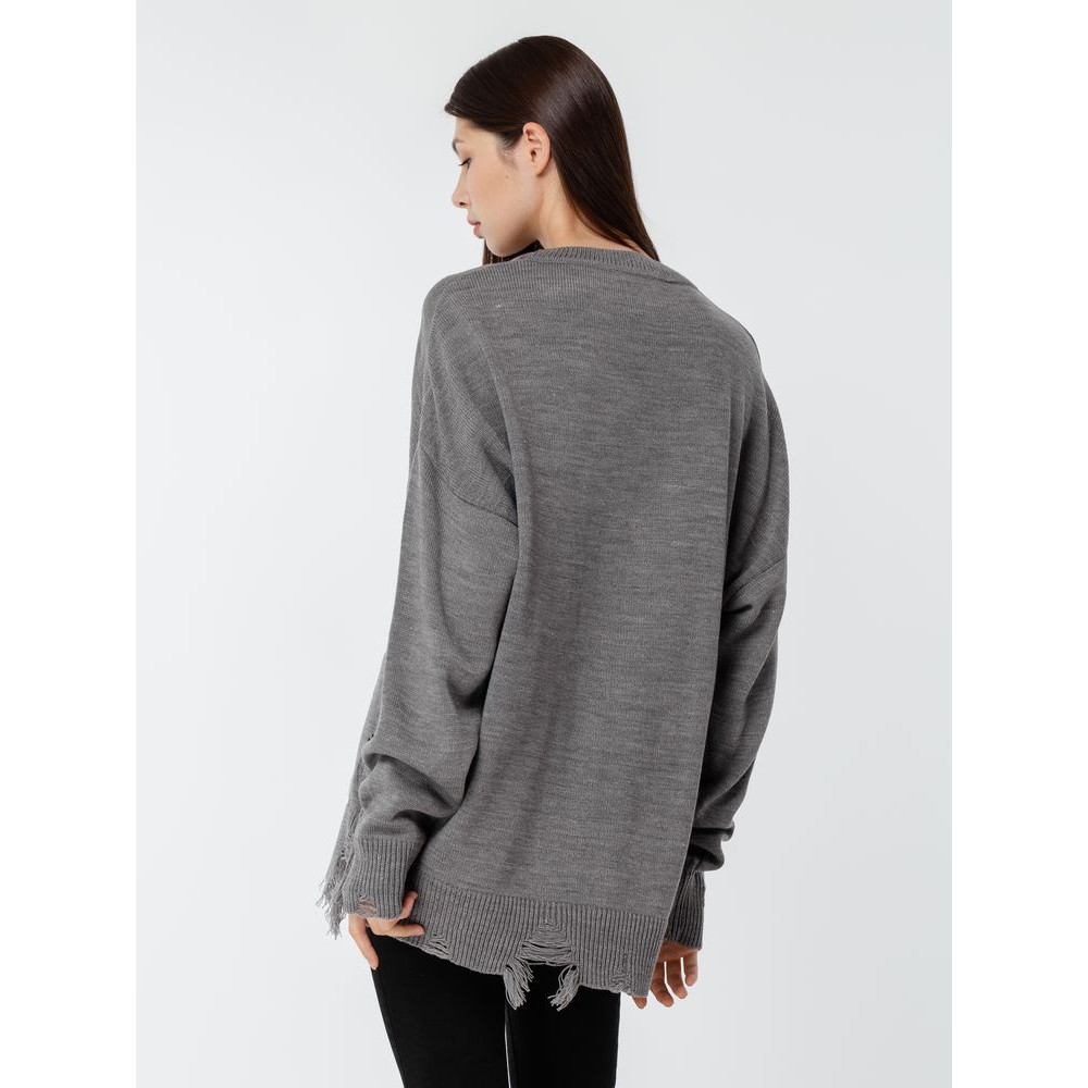 Оверсайз джемпер с круглым вырезом и рваными краями. Ворот, манжеты и низ изделия выполнены резинкой.