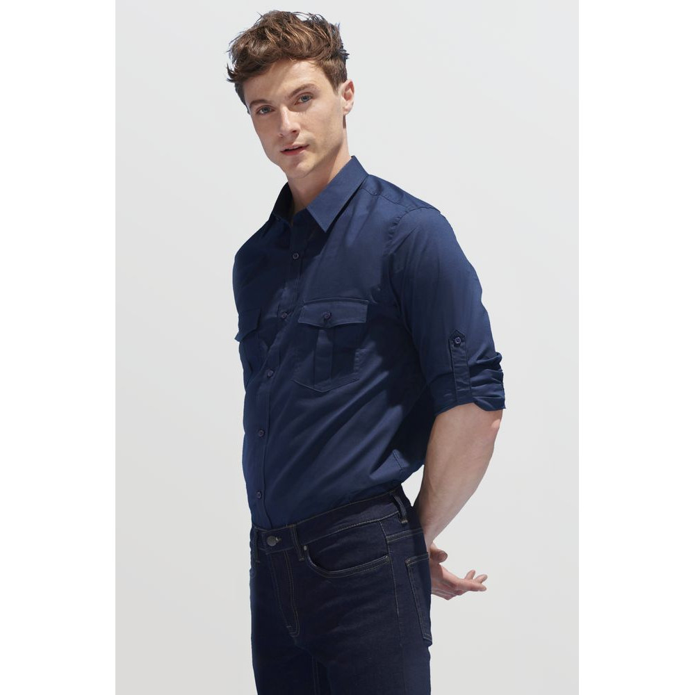 Рубашка прямого кроя в стиле «сафари» с планкой на 7 пуговиц в тон и манжетами на 1 пуговице.