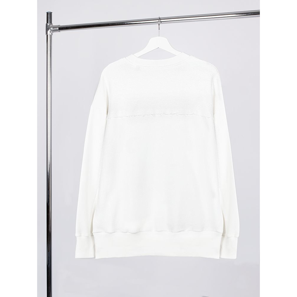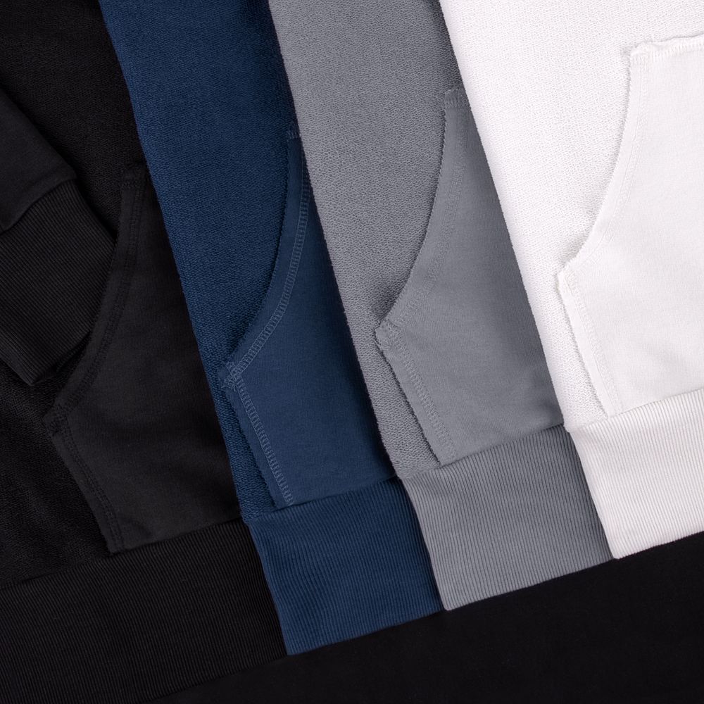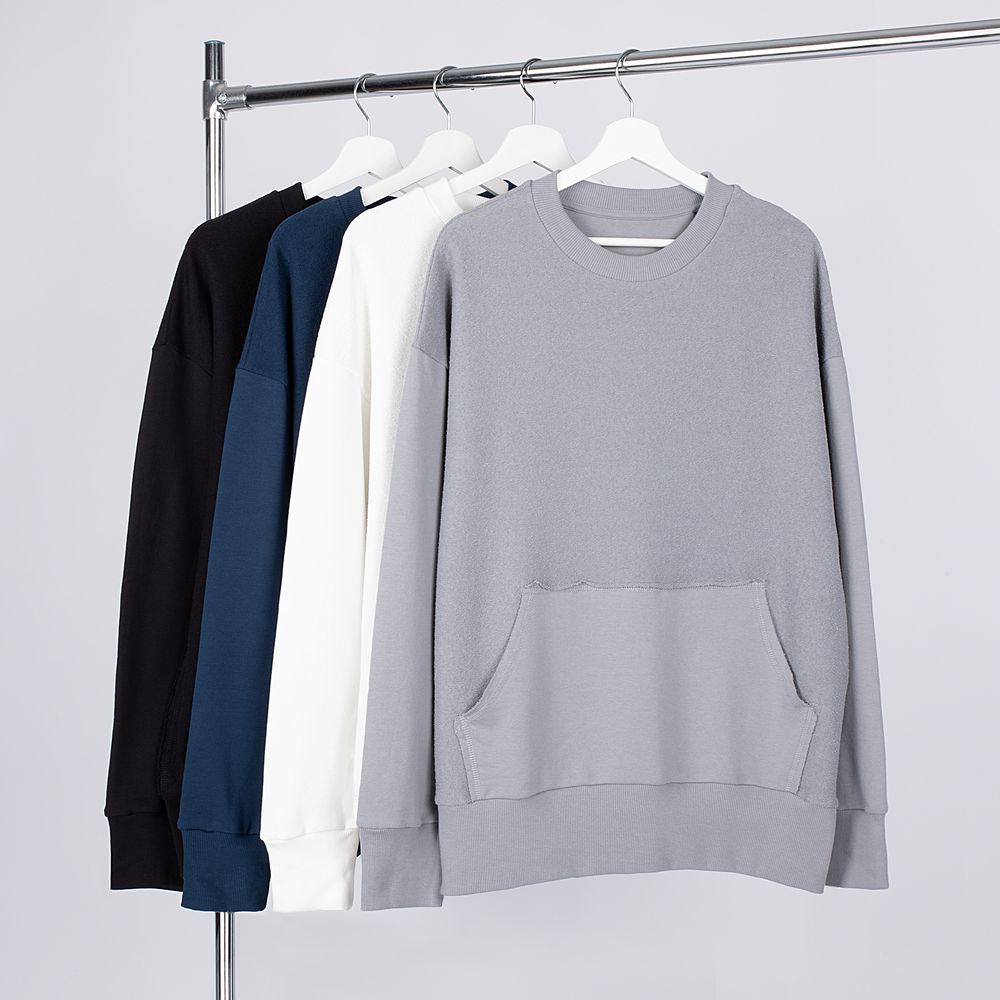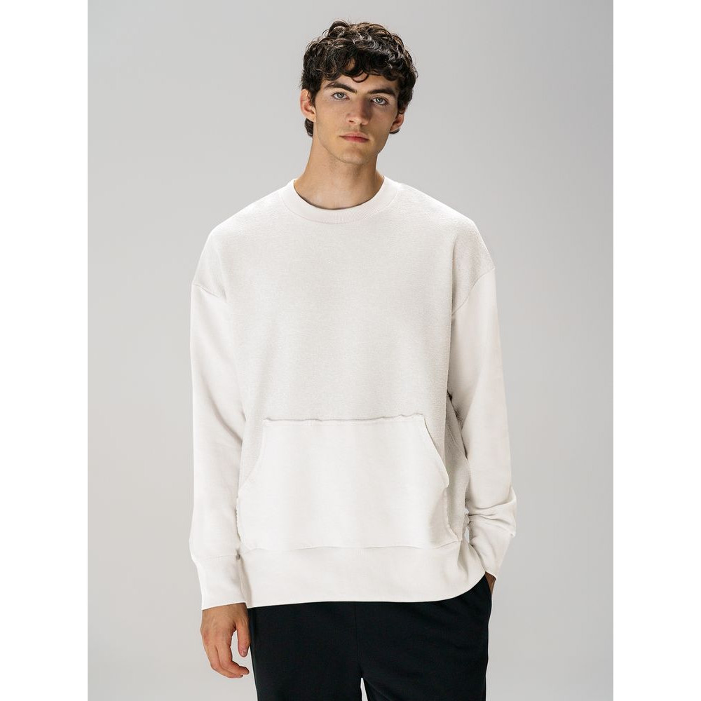 Благодаря особой конструкции, где часть деталей — перед и спинка — вывернута наизнанку, свитшот приобретает запоминающийся вид. Так внутренняя, обычно незаметная сторона материала превращается в лицевую: миниатюрные петельки бывшей изнанки становятся настоящим украшением толстовки, добавляя ей оригинальности и эффект невероятно приятной плюшевости.