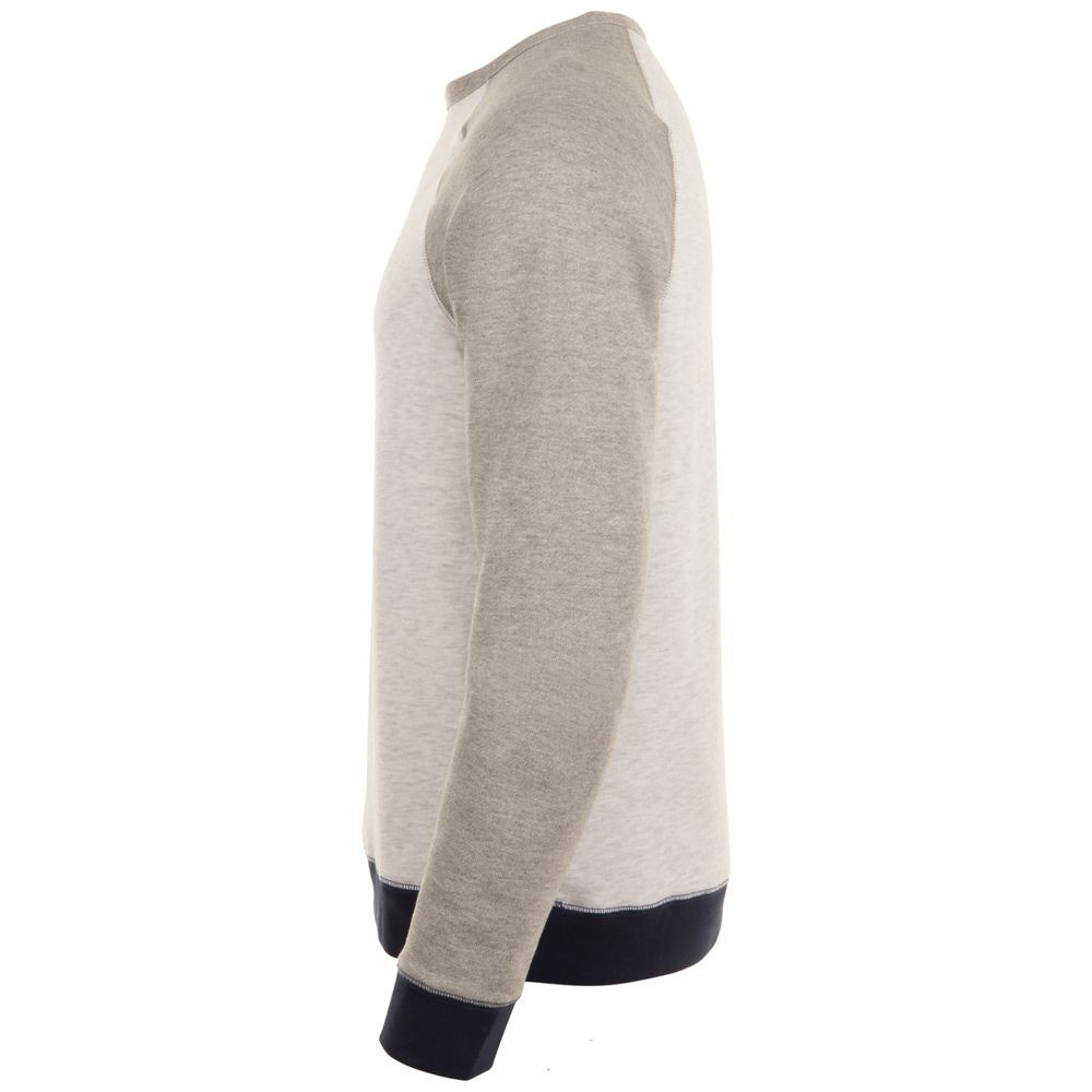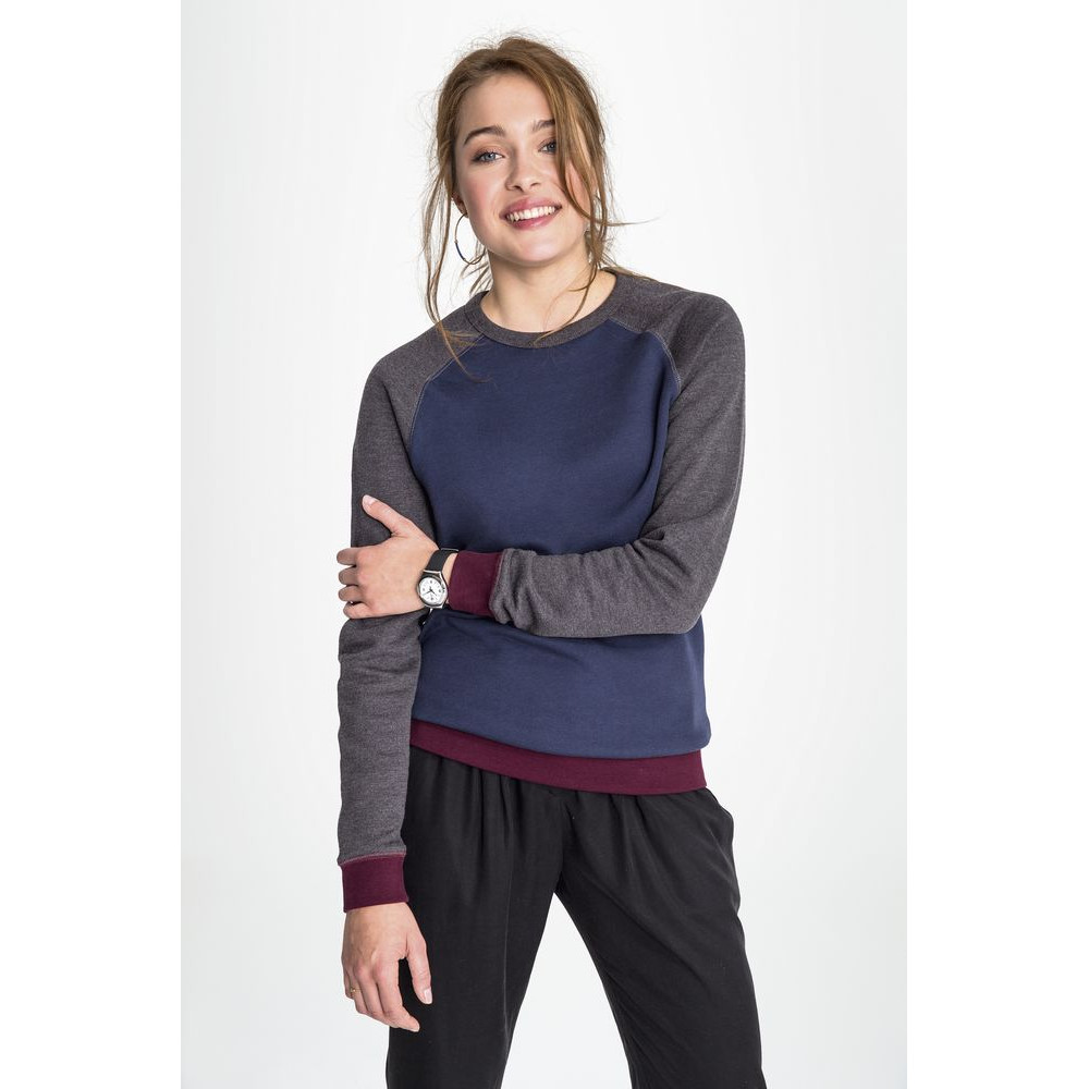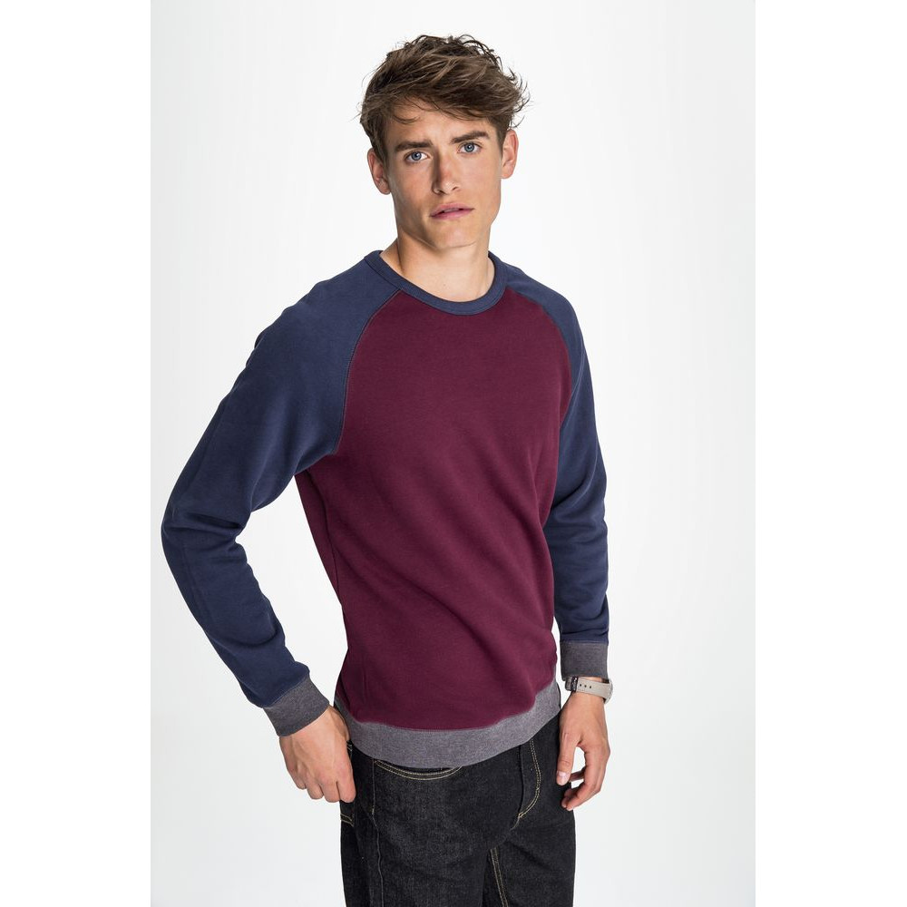 Трехцветный свитшот в стиле 80-х с рукавом реглан. Лейбл производителя в боковом шве изнутри, в шве горловины — только бирка с размером, что позволяет вам нанести свой логотип.