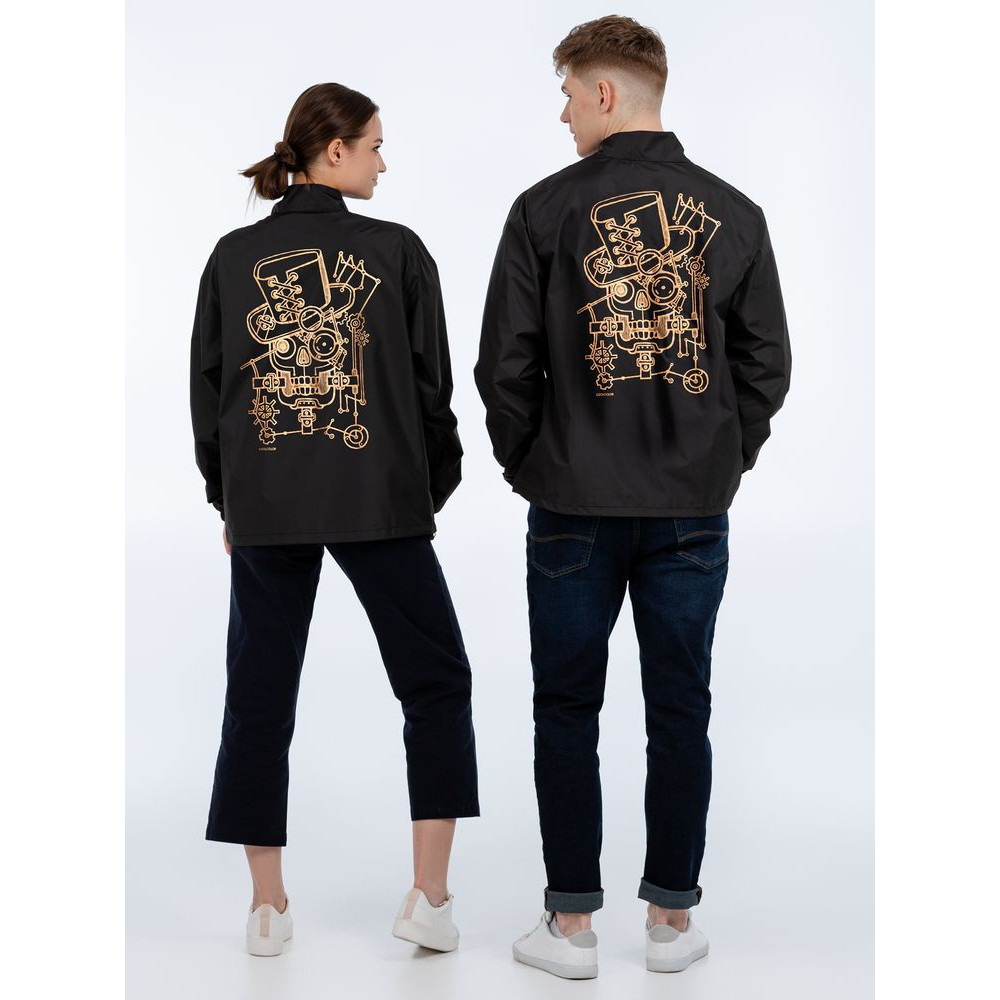 Пришло время впустить пар! Берем пример с Джонни-черепа: бронзовые и латунные оттенки, очки-гогглы, пара дюжин шестеренок и механизмов всех мастей, цепи, колбы и черный цилиндр. Все, теперь ваш образ в стиле стимпанк готов. Можно отправляться в будущее или прошлое – куда пожелаете?Ветровка на молнии с капюшоном и одним карманом с правой стороны.
