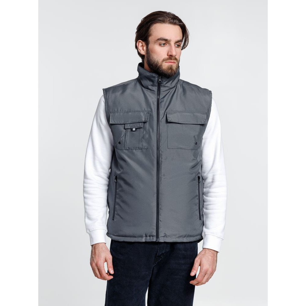 Мужской утепленный жилет с воротником-стойкой и удлиненной спинкой. Выполнен из ткани оксфорд с водоотталкивающим покрытием.