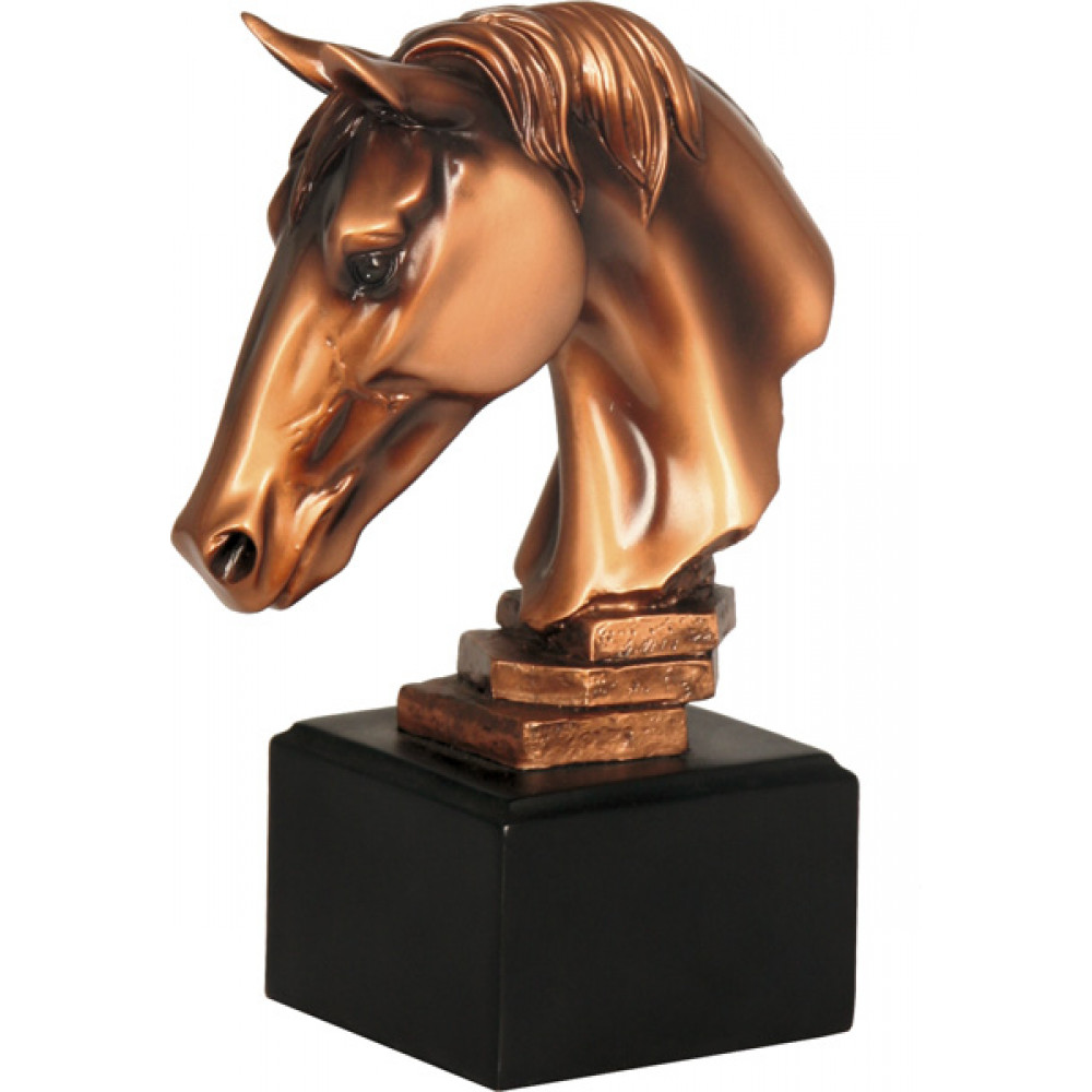 Фигурка литая "Лошадь". Цвет бронза. Материал: пластик. Высота 18,5 см. Изображена голова лошади, взгляд устремлен вниз. Лошадь установлена на три плоские геометрические фигуры: верхняя фигура шестиугольник, фигура по середине восьмиугольник, нижняя фигура квадрат. Фигурка установлена на цоколе в форме куба, цвет черный.