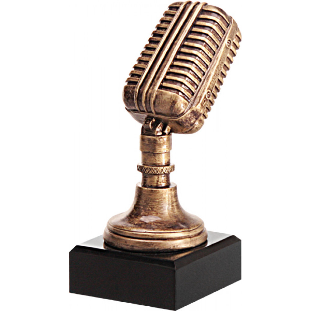 Фигурка литая "Музыка". Цвет - бронза. Высота 17 см. Изображен микрофон в форме параллелепипеда с округлыми сторонами, на нем нанесены горизонтальные и вертикальные рельефные полосы. Микрофон установлен на черной подставке в форме квадрата.