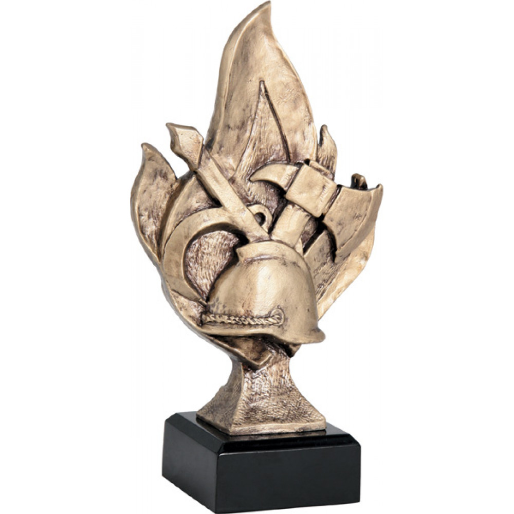 Фигурка литая "Пожарный". Цвет бронза. Материал: пластик. Высота 16; 19; 22 см. Изображена каска с перекрещенными на заднем плане топорами. Данные символы расположены на фоне пламени огня. Фигурка установлена на цоколе квадратной формы, цвет черный.