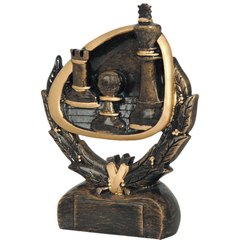 Фигурка литая "Шахматы". Цвет бронза. Материал: пластик. Высота 17 см. Изображены лавровые ветви, сложенные в форме подковы, у основания ветвей изображена золотая лента. Между ветвей находятся три шахматные фигуры: ладья, пешка, король, обведенные золотой линией в окружность. Цоколь фигуры в форме полукруга со срезанной поверхностью для нанесения персонализации.