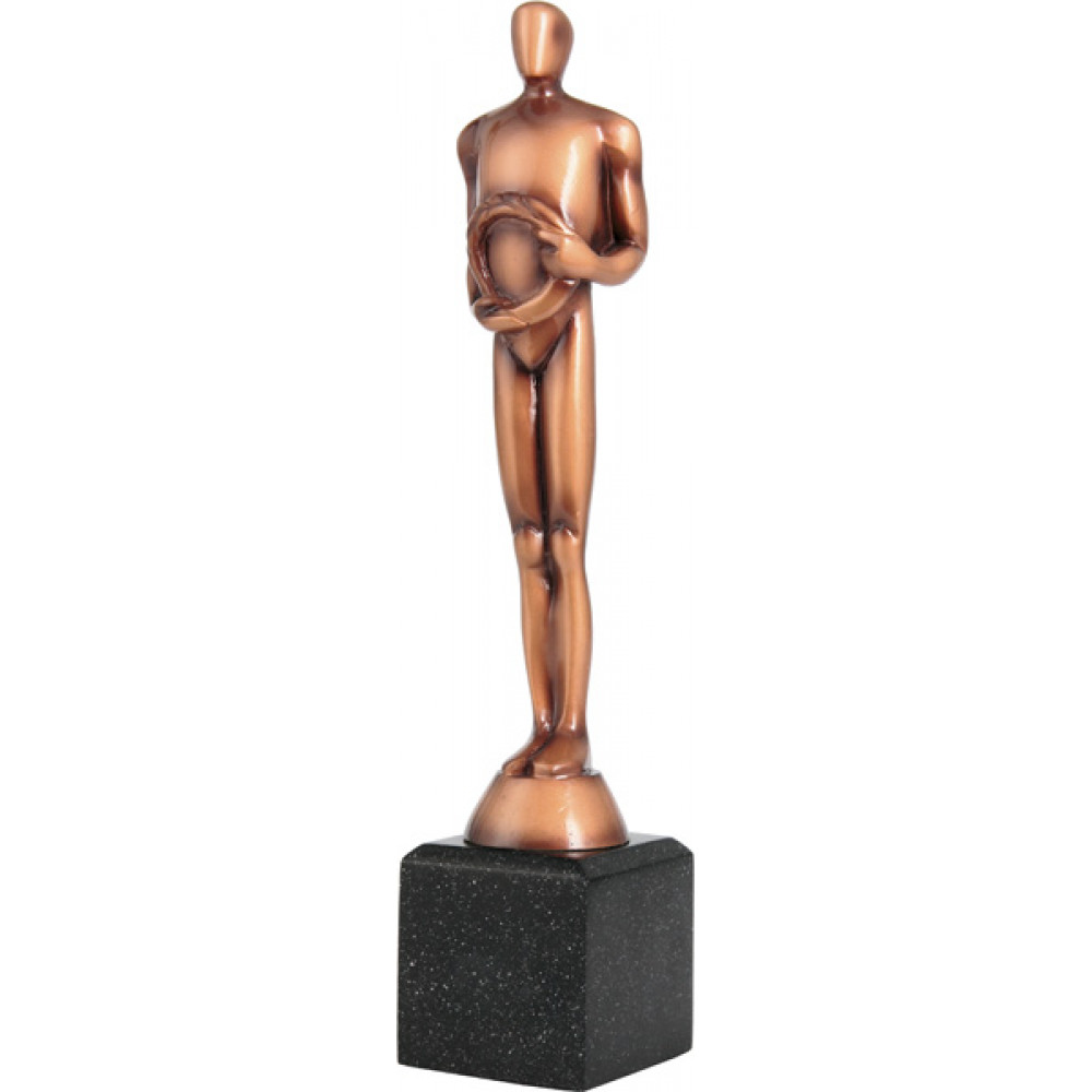 Фигурка литая "Оскар". Цвет бронза. Материал: пластик. Представляет собой силуэт мужчины, держащий в руках лавровый венок. Фигурка установлена на цоколе в форме куба, цвет черный.