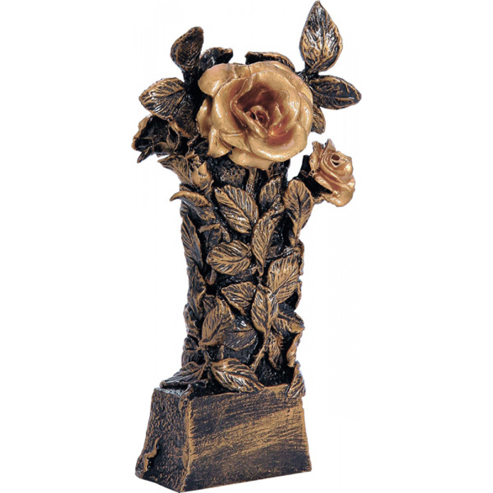Фигурка литая "Трофей". Цвет бронза. Материал: пластик. Высота 20 см. Изображен столб, обвитый стволами и листьями роз. На вершине два распустившихся цветка. Цоколь фигурки слитый, в форме параллелепипеда.