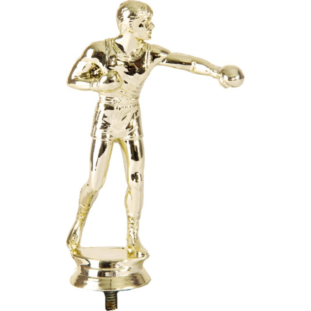 Цвет: золото, материал: пластик. Вид спорта: бокс. Фигурка выполнена в виде фигуры мужчины-боксера. Он наносит удар невидимому противнику. Его левая рука в перчатке выставлена вперёд, а правая прижата к телу на уровне груди. Ноги расставлены на ширине плеч, левая нога отведена немного назад. Боксёр одет в футболку и шорты. Ощущение движения создаётся за счёт складок на одежде. Высота, см: 13.7 Вес, кг: 0.04. Фигурку возможно закрепить на цоколь, постамент или кубок.