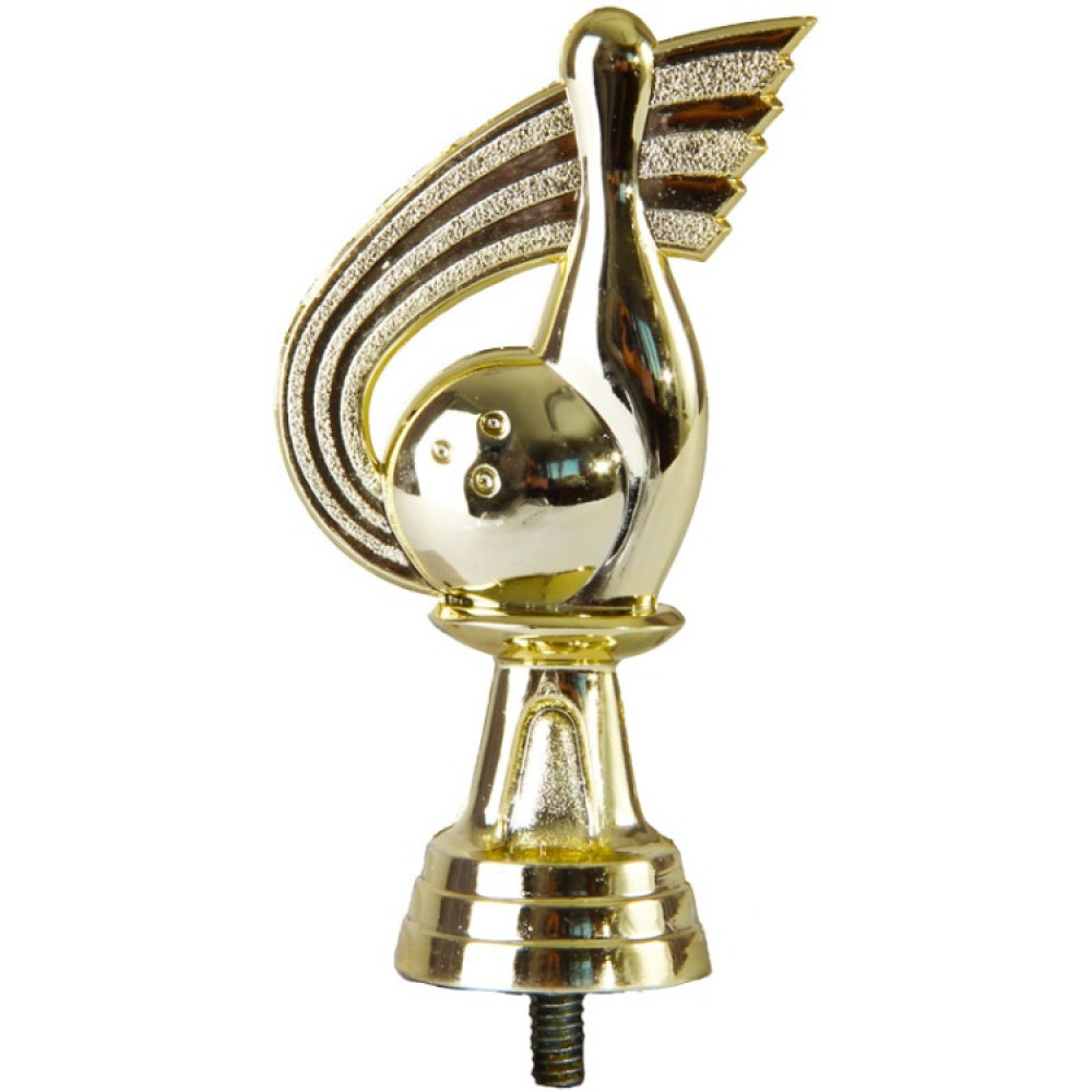 Цвет: золото, материал: пластик. Вид спорта: боулинг. Фигурка выполнена в виде объёмной большой кегли, рядом – мяч для игры в боулинг. Справа от объёмных фигур отходит дорожка, плавно загнутая вправо. Все элементы находятся на подставке с ровной поверхностью, выполненной в форме круга. Ниже - круглое основание, на котором имеются горизонтальные линии. Фигурка выполнена в золотом цвете. Высота, см: 10.8 Вес, кг: 0.033. Фигурку возможно закрепить на цоколь, постамент или кубок.