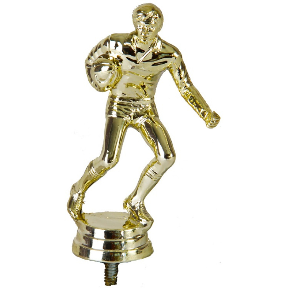 Цвет: золото, материал: пластик. Вид спорта: регби. Фигурка выполнена в виде спортсмена, несущего мяч. Его правая рука вытянута в перёд, а в левой руке зажат мяч. Спортсмен одет в спортивную форму, не стесняющую движения. Ноги согнуты в коленях. Левая нога немного повёрнута в сторону, а правая приподнята на носок. Ниже - круглое основание, на котором имеются горизонтальные линии. Высота, см: 12.1 Вес, кг: 0.033. Фигурку возможно закрепить на цоколь, постамент или кубок.