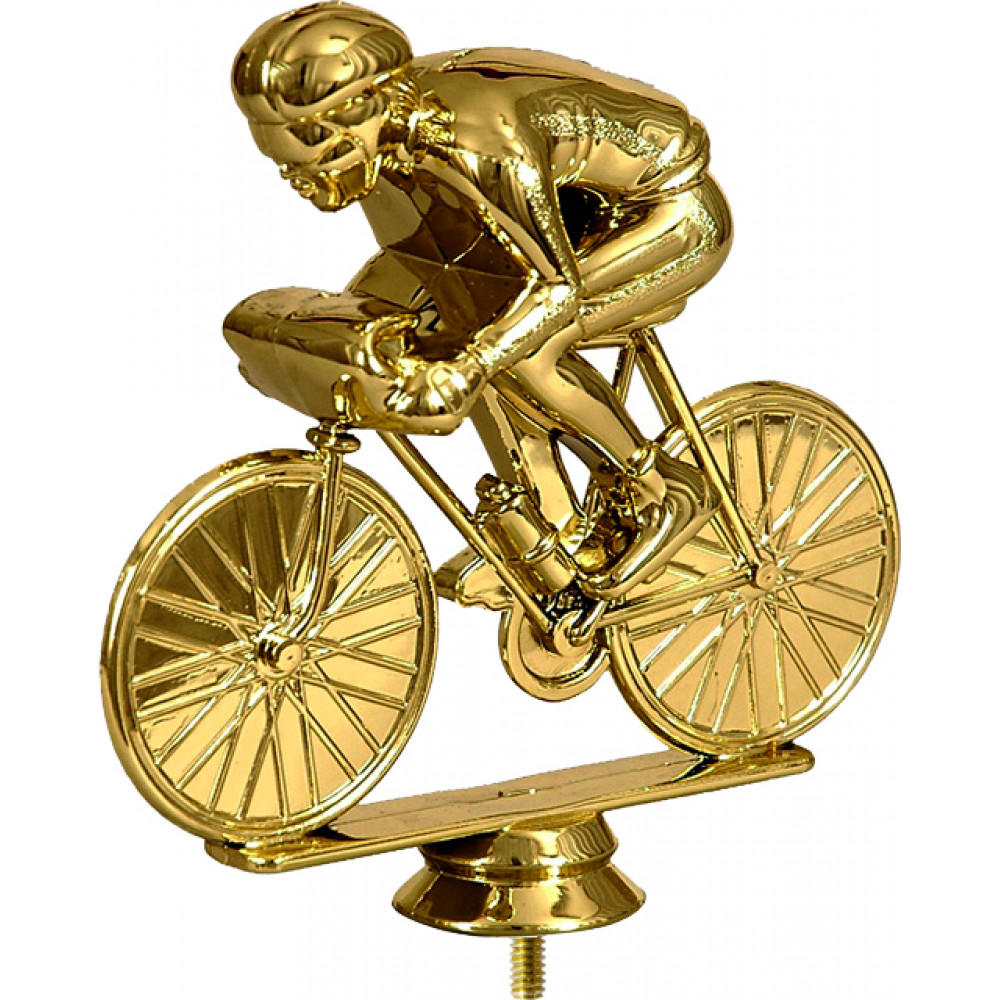 Фигурка пластиковая "Велоспорт". Цвет золото. Высота 12 см. Изображен велосипедист, одетый в штаны, кофту, кроссовки, вело шлем. Корпус велосипедиста наклонен вперед, к рулю, левая нога согнута в колене и выставлена вперед.¶Фигурка установлена на плоской прямоугольной подставке, под ней находится стем в виде небольшого элемента конусообразной формы. ¶Фигурку возможно закрепить на цоколь, постамент или кубок.