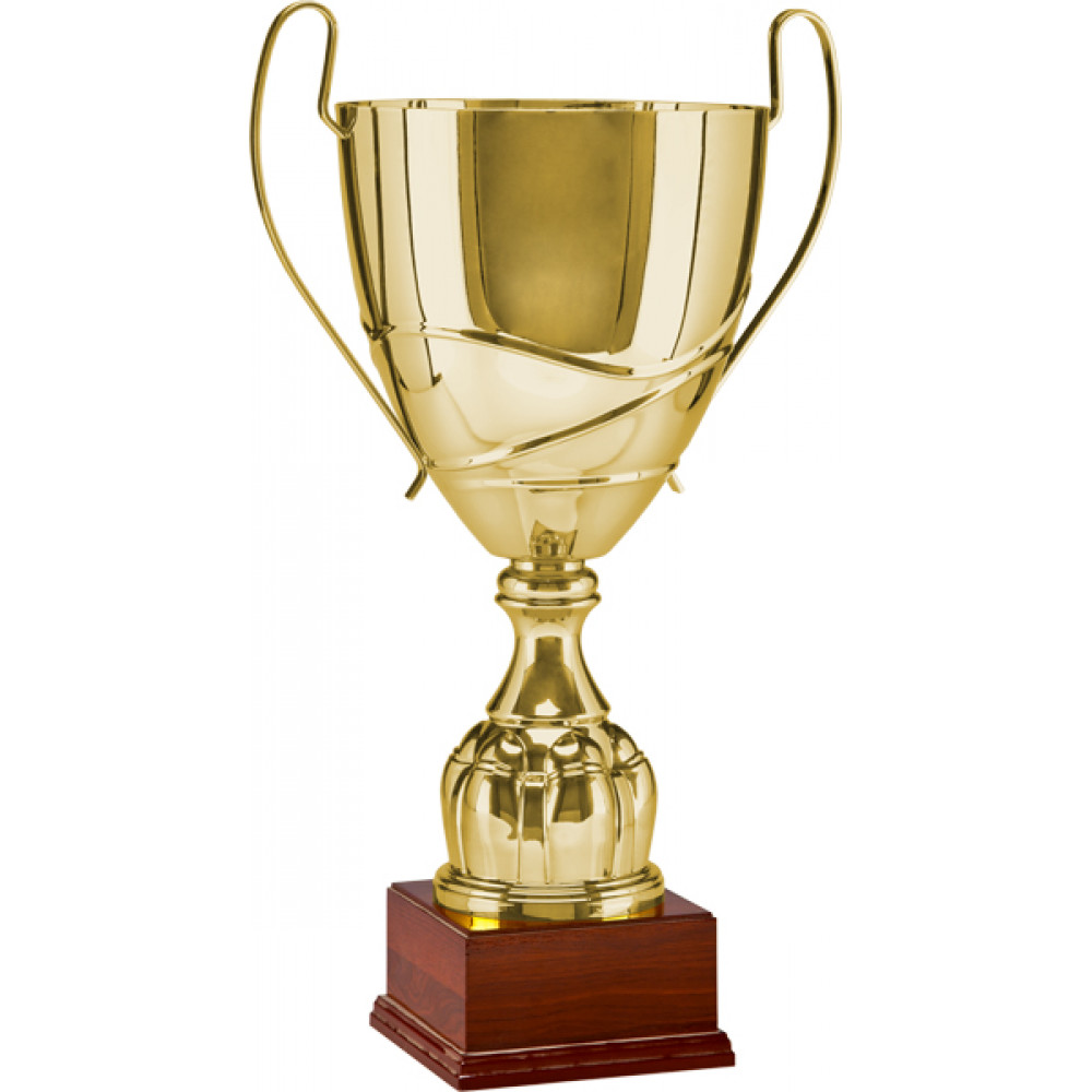 Кубок металлический, состоит из чаши, стема и цоколя. ¶Чаша кубка изготовлена из стали с гальваническим покрытием, цвет внутри и снаружи - золото. К чаше прикреплены ручки, выступающие за её края. Ручки гладкие, тонкие. Чаша глубокая, в нижней части чаши нанесен узор в виде трех выпуклых извилистых линий, линии не соприкасаются. Стем кубка выполнен из металлизированного пластика, цвет - золото. Стем имеет форму перевернутого конуса. В верхней части стема находится элемент в виде кольца. В нижней части стема расположены выпуклые лепестки, стремящиеся вверх, по всему диаметру, стем имеет отступ внизу, установлен на цоколь. Цоколь в форме куба, материал - дерево, цвет - коричневый. Цоколь имеет отступ внизу.