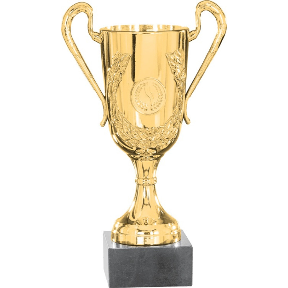 Кубок состоит из трех элементов: чаша, стем, цоколь. ¶Чаша и стем кубка изготовлены из металлизированного пластика, цвет внутри и снаружи - золото. Чаша гладкая,без декоративного рельефа. К чаше прикреплены ажурные ручки. Стем плоский, округлый. Посередине располагается место под вставку 25 мм и 50 мм. По краям место под вставку украшено лавровыми ветвями. Цоколь кубка имеет квадратную форму. Материал - мрамор. Цвет - белый, неоднородный.