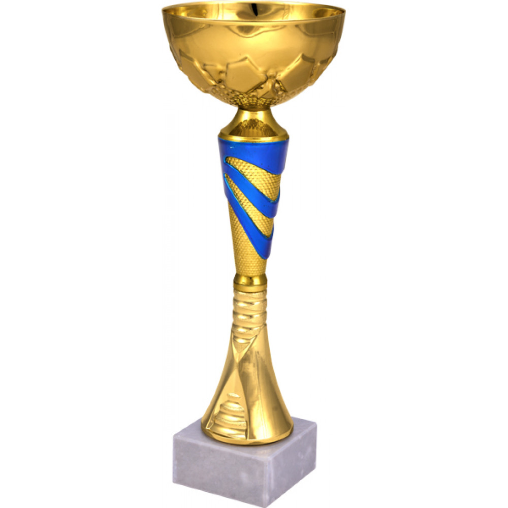 Кубок состоит из трех элементов: чаша, стем, цоколь. ¶Чаша кубка изготовлена из стали, с гальваническим покрытием. Цвет внутри и снаружи - золото. Форма чаши - полушар. Чаша имеет рельеф по всей окружности в виде выпуклых фигур, напоминающих граненные самоцветы. Рельеф расположен у основания чаши. ¶Стем состоит из трех частей. Верхняя часть стема кубка представлена в форме короткого конусообразного элемента с гладкой поверхностью, цвет - золото. Средняя часть стема золотого цвета, имеет форму перевернутого конуса. Поверхность элемента представлена мелкими частыми точками, в верхней части расположен узор в виде широких полос синего цвета, идущих по диаметру. Нижняя часть стема золотого цвета, имеет конусообразную форму. Имеет узор в виде рельефных окантовывающих линий, идущих по всей высоте элемента. В центральной и нижней части линии огибает широкий элемент с гладкой поверхностью.¶Цоколь кубка имеет квадратную форму. Материал - мрамор. Цвет - белый, неоднородный.
