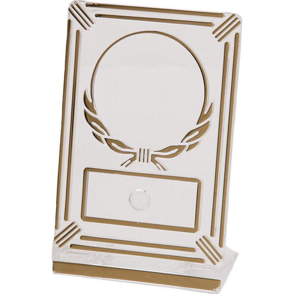 Награда пластиковая. Представляет собой фигуру в форме вертикального прямоугольника. По центру изображены очертания места под вкладку круглой формы, под ним место для шильда прямоугольной формы, по краям нанесены по две параллельные линии, в углам - по три параллельные короткие линии в сторону центра фигуры. Цвет фигуры - прозрачный, изображения вдавленные, нанесены бронзовым цветом.