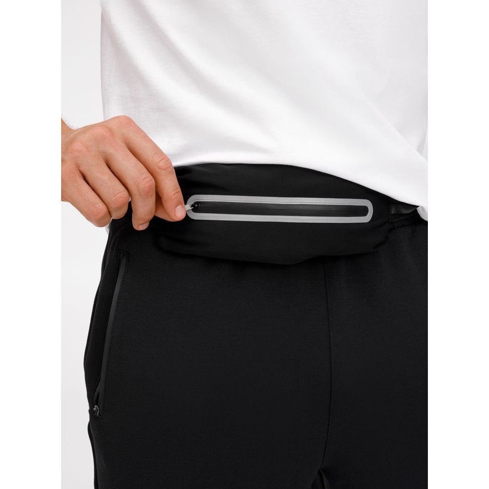 Регулируемый ремень из широкой эластичной резинки с плоским фастексом плотно облегает тело и удерживает сумку во время тренировок. Водоотталкивающая пропитка ткани защитит от влаги и грязи, а светоотражающие детали помогут оставаться заметными во время тренировок в сумерках и темноте.