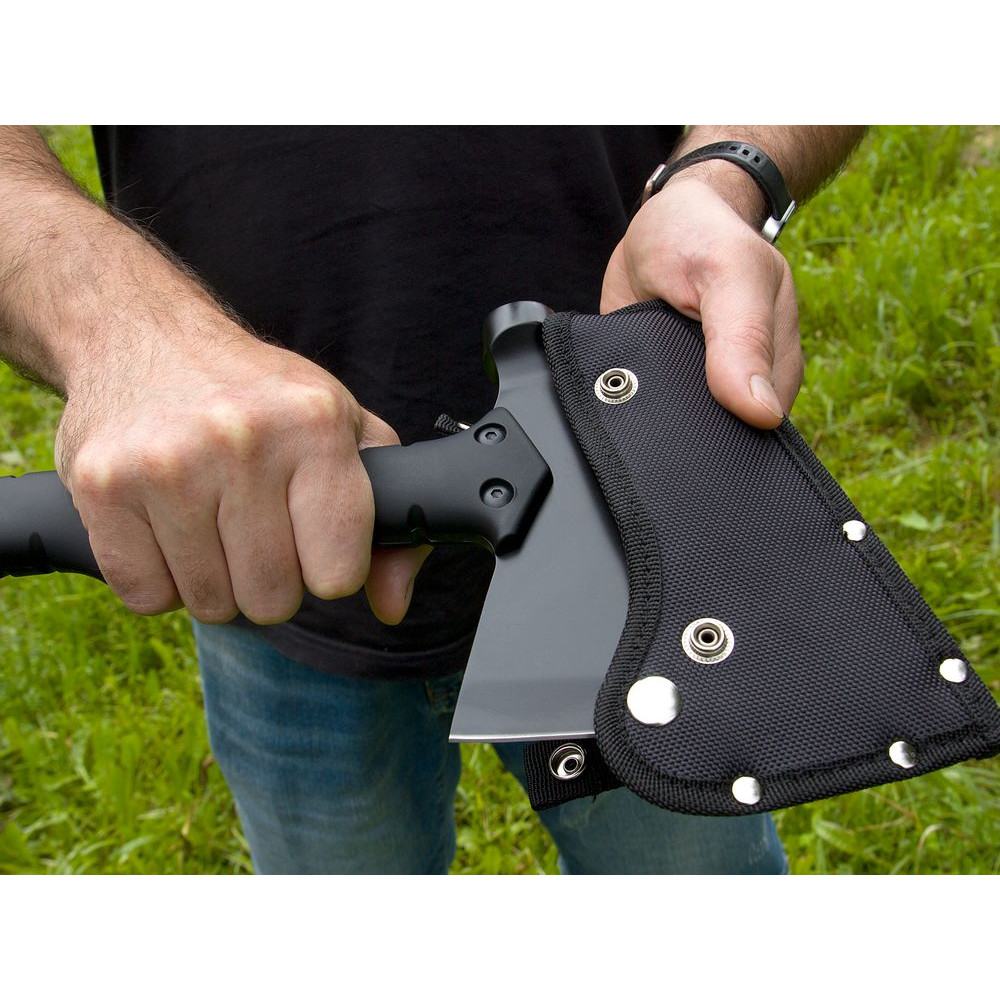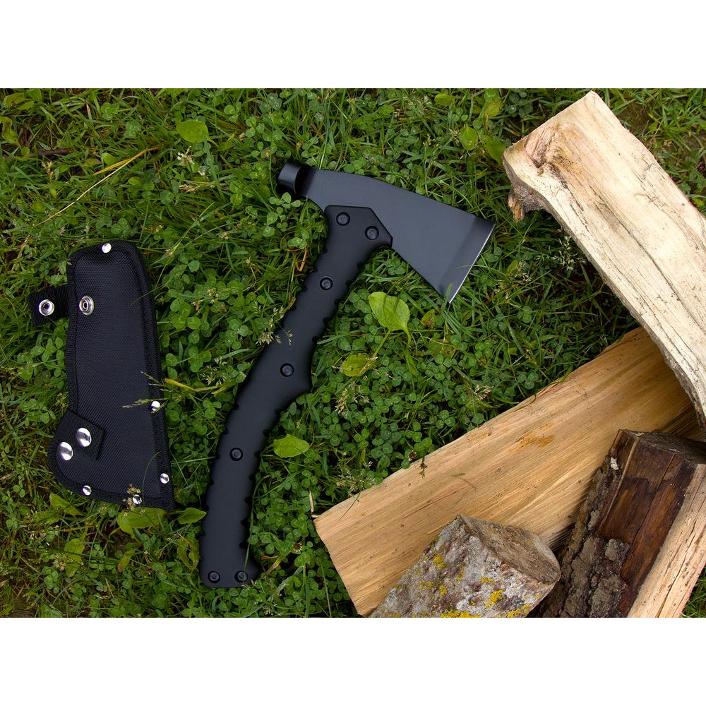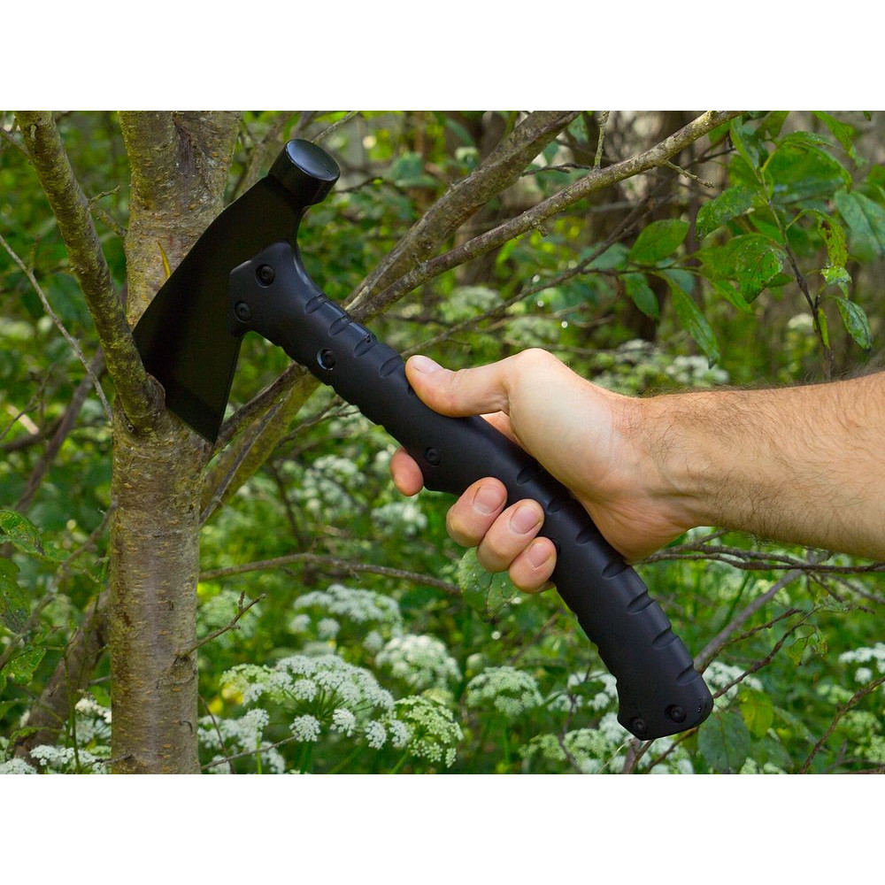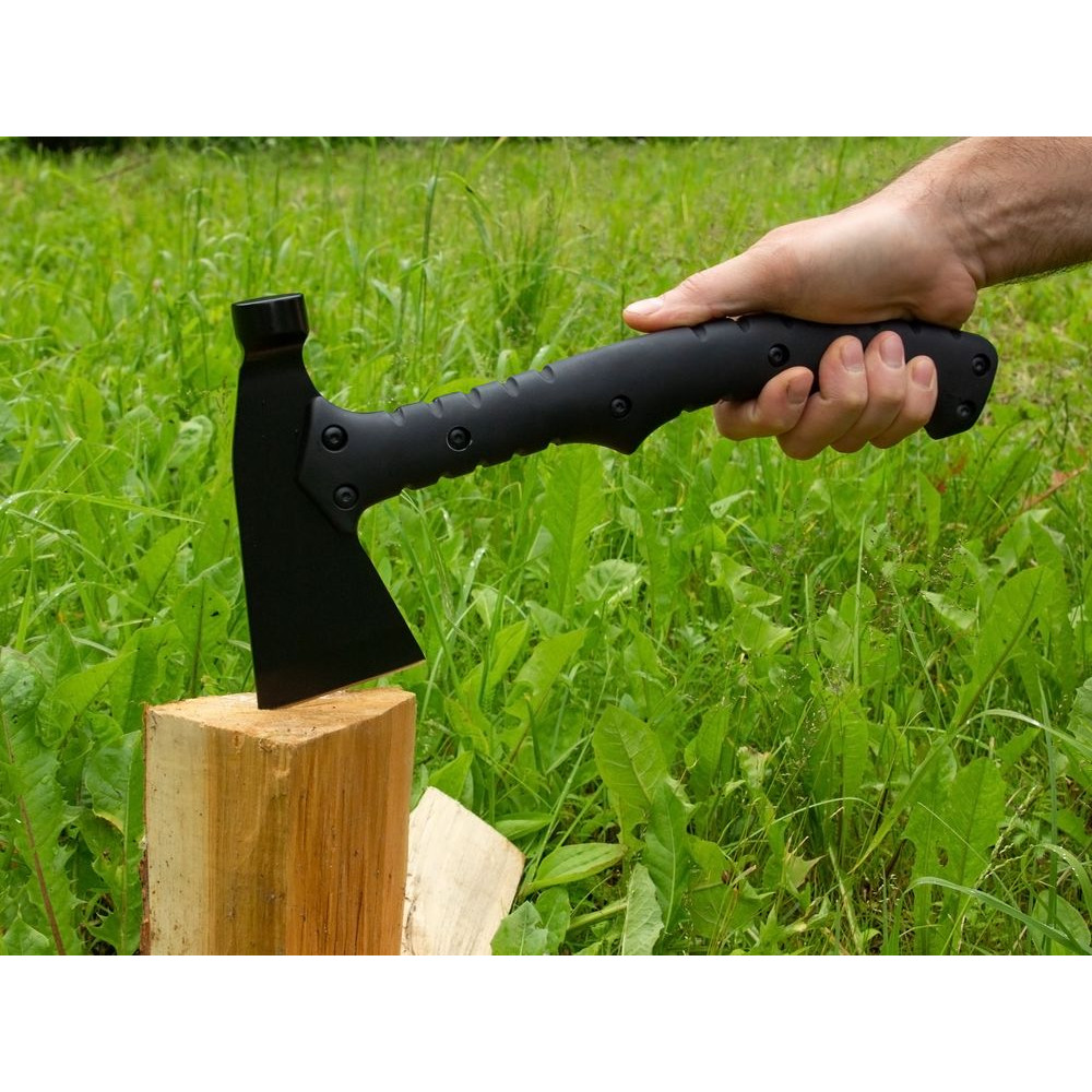 Туристический топор с молотком на обухе поможет нарубить дрова, расчистить место для стоянки, подготовить кострище и поставить лагерь.