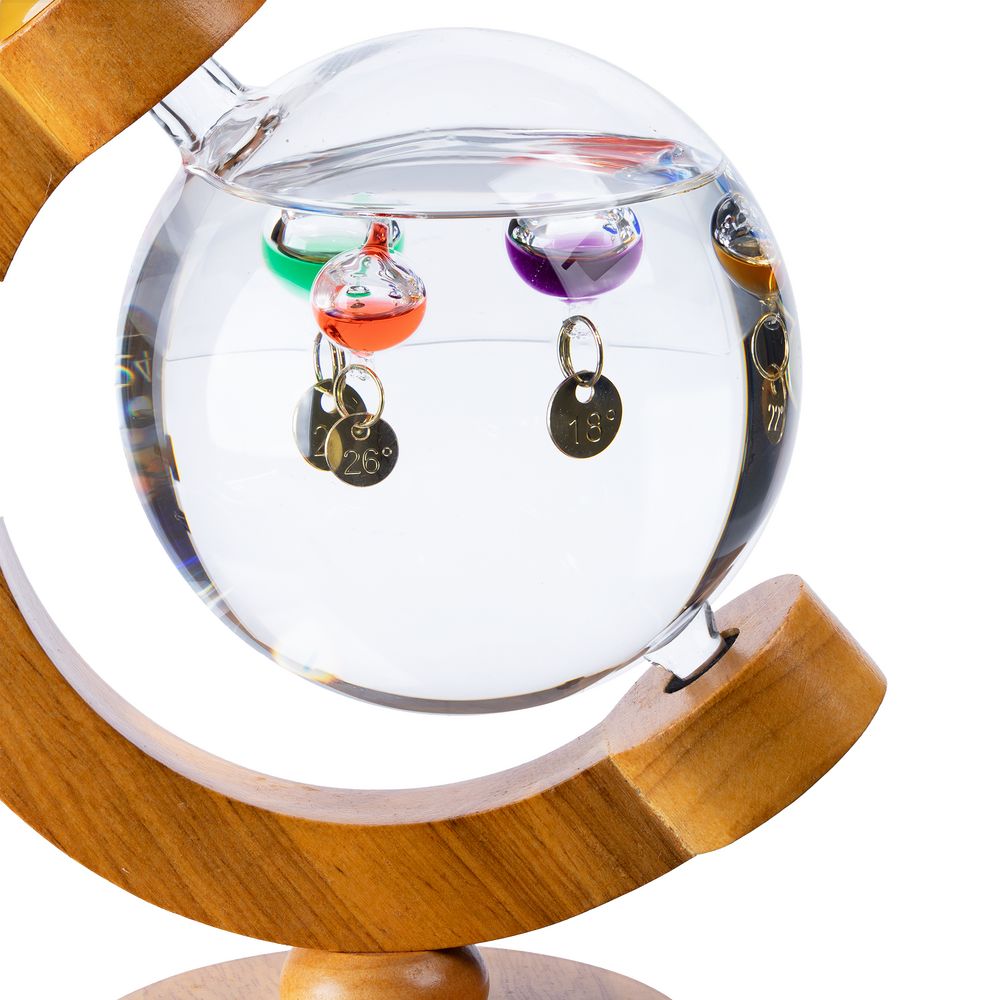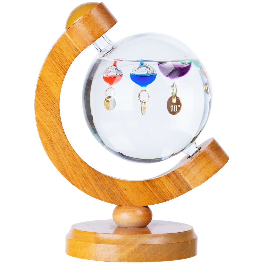 Термометр Галилео оригинальной формы, напоминающей глобус, добавит индивидуальности домашнему или офисному интерьеру. В основе его работы лежит физическая закономерность, впервые отмеченная великим Галилео Галилеем: плотность жидкости увеличивается при снижении температуры и уменьшается при ее повышении. И теперь стеклянные шарики в жидком парафине не только радуют глаз, но и позволяют с легкостью определить температуру в помещении.