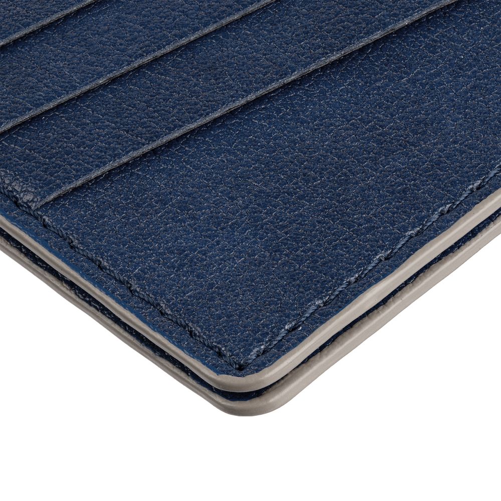 Чехол выполнен из материала Petrus, синий НН, дополнен окрашенным срезом края и внутренним карманом из серого картона. Имеет 4 отделения для кредитных карт и 1 отделение для купюр.