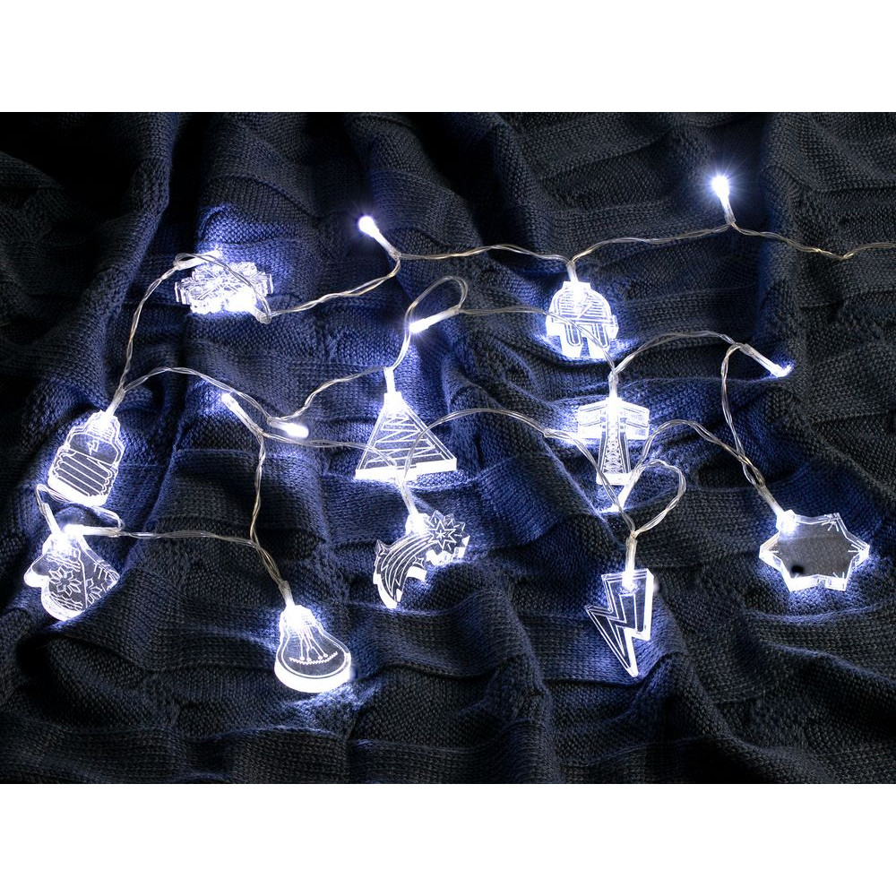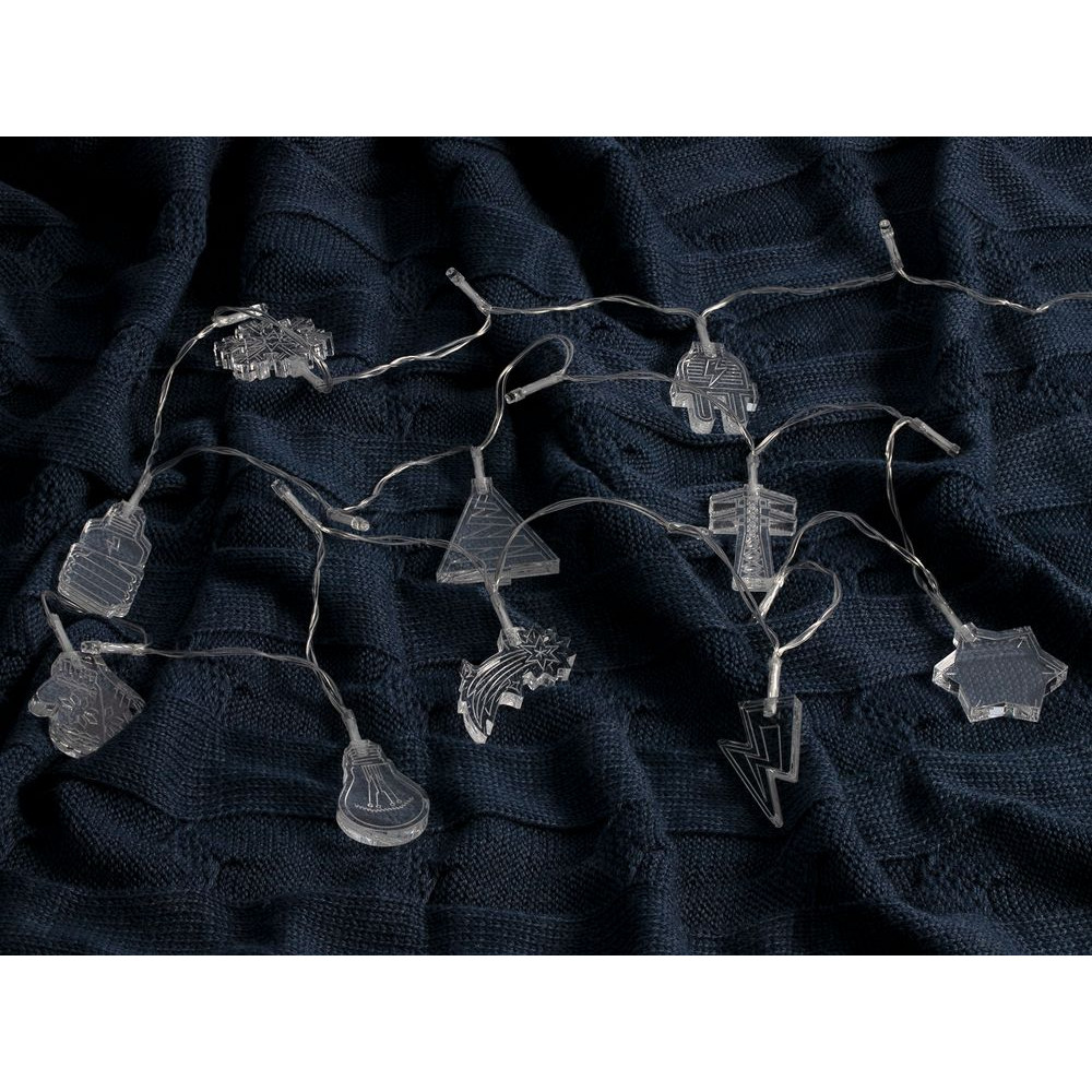 Гирлянда состоит из 20 светодиодов с холодным светом и 10 акриловых фигурок.