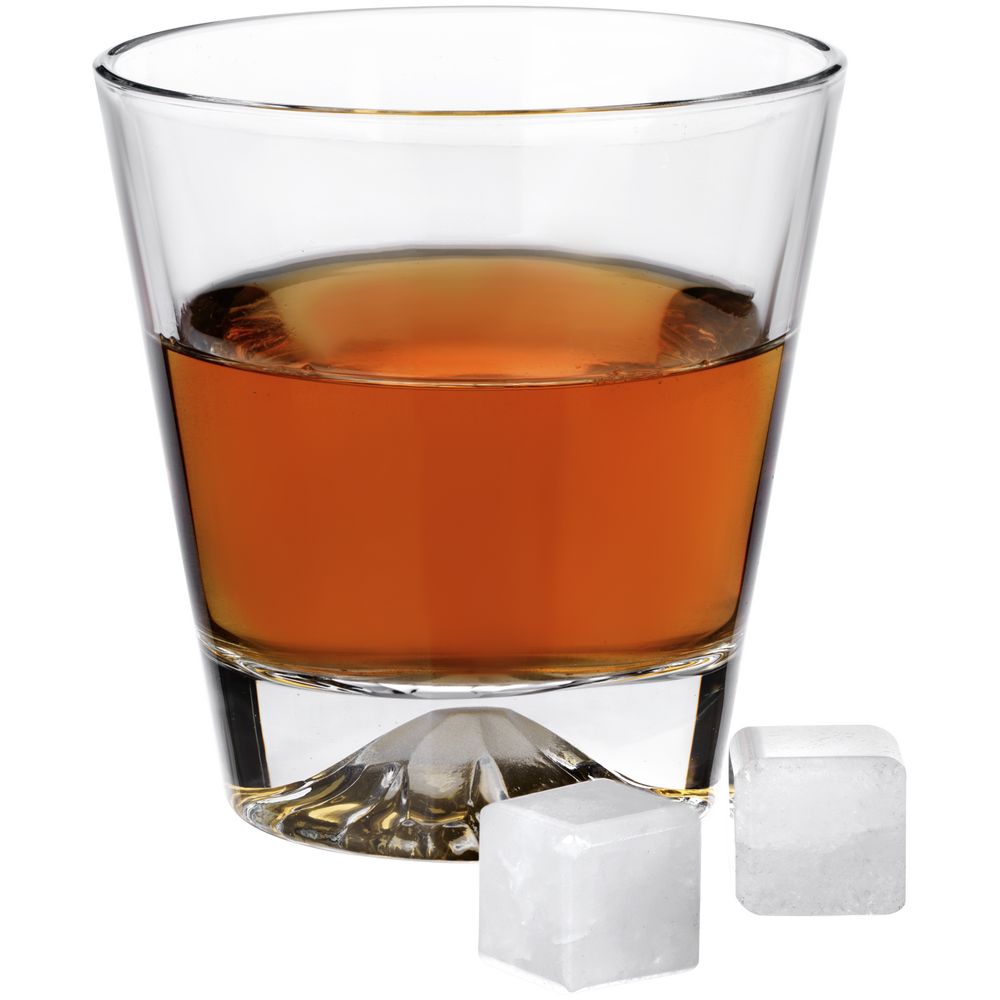Дно бокалов выполнено таким образом, что кажется, будто в него заключена гора со снежной шапкой, а изготовленные из белого кварца камни для охлаждения напитка выглядят точь-в-точь как кубики льда.