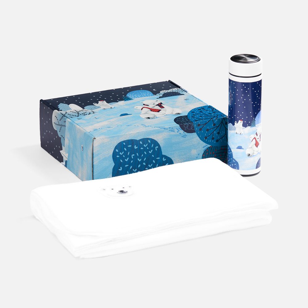 Все составляющие набора украшены милыми изображениями с белыми мишками — одним из главных зимних символов. Это дарит настоящее ощущение праздника — будто маленький очаг тепла, который всегда можно взять с собой.