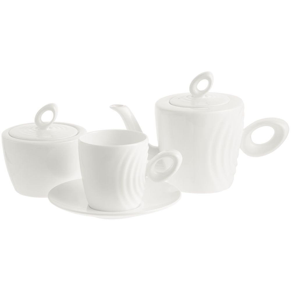 Форма сервиза создана в скульптурной технике: фарфор словно запечатлел сам момент движения. Необычная ручка предметов символизирует камень, от которого появляются завораживающие круги на воде — корпусе изделия.