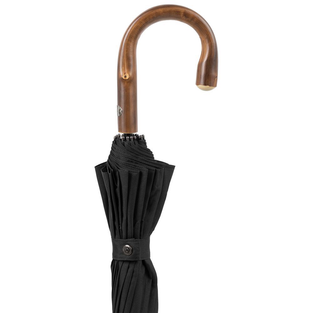 Солидный изысканный зонт с ручкой из дерева и 16 спицами. Большой купол легко укроет от дождя сразу двоих, а надежная конструкция выдержит даже сильный ветер.
