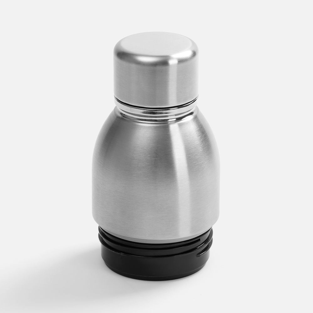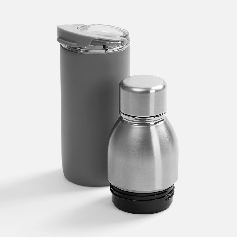 Varianti — это яркий пример посуды с двойной функциональностью. Один и тот же корпус можно превратить как в термостакан для чая и кофе с пластиковой крышкой, так и в термобутылку для прохладительных напитков — с крышкой стальной.
