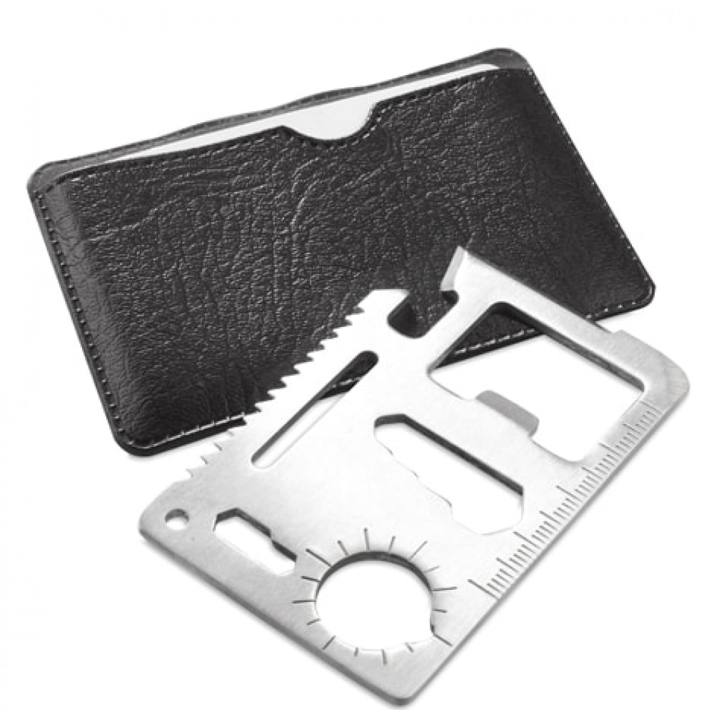 Универсальный инструмент в корпусе из нержавеющей стали с 11 функциями. С консервным ножом, ножом, отверткой, линейкой, открывалками для бутылок, гаечными ключами, ключами-бабочками, пилой и транспортиром. Представлен в прочном кожаном футляре.