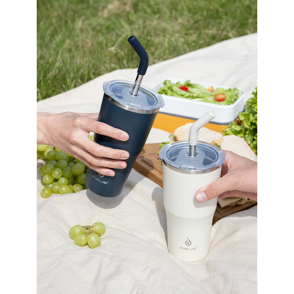 • 2 крышки в комплекте: одна на 100% герметичная с механизмом блокировки отверстия для питья, вторая — с отверстием для трубочки