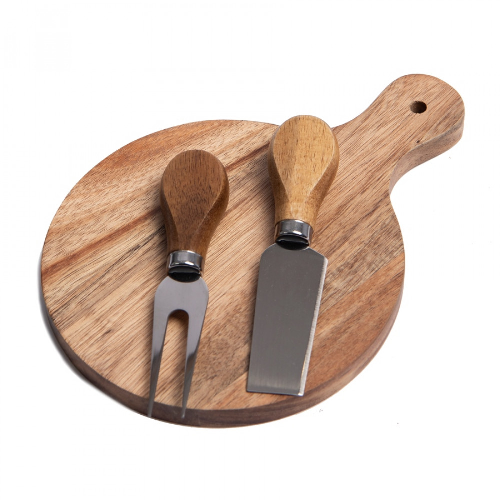 Набор для сыра: круглая доска с ручкой и два инструмента в комплекте -нож для мягкого сыра и вилка.