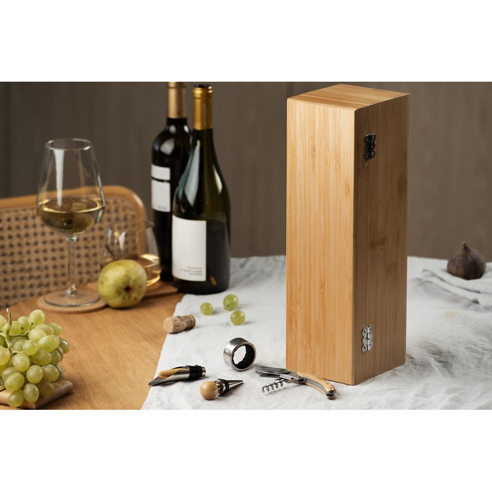 Набор для вина Vinotech с футляром для бутылки — оригинальный и функциональный подарок. Штопор поможет бережно и без усилий откупорить бутылку, а чтобы вино не расплескалось и не оставило пятен, пригодится кольцо-каплеуловитель, надетое на горлышко открытой бутылки: так капли не будут стекать на стол или скатерть. Аэратор поможет аромату вина раскрыться, а винная пробка сохранит свежесть и вкус напитка еще некоторое время после откупоривания бутылки.В наборе: