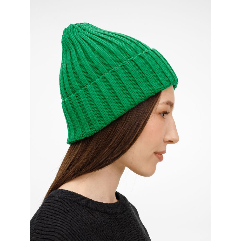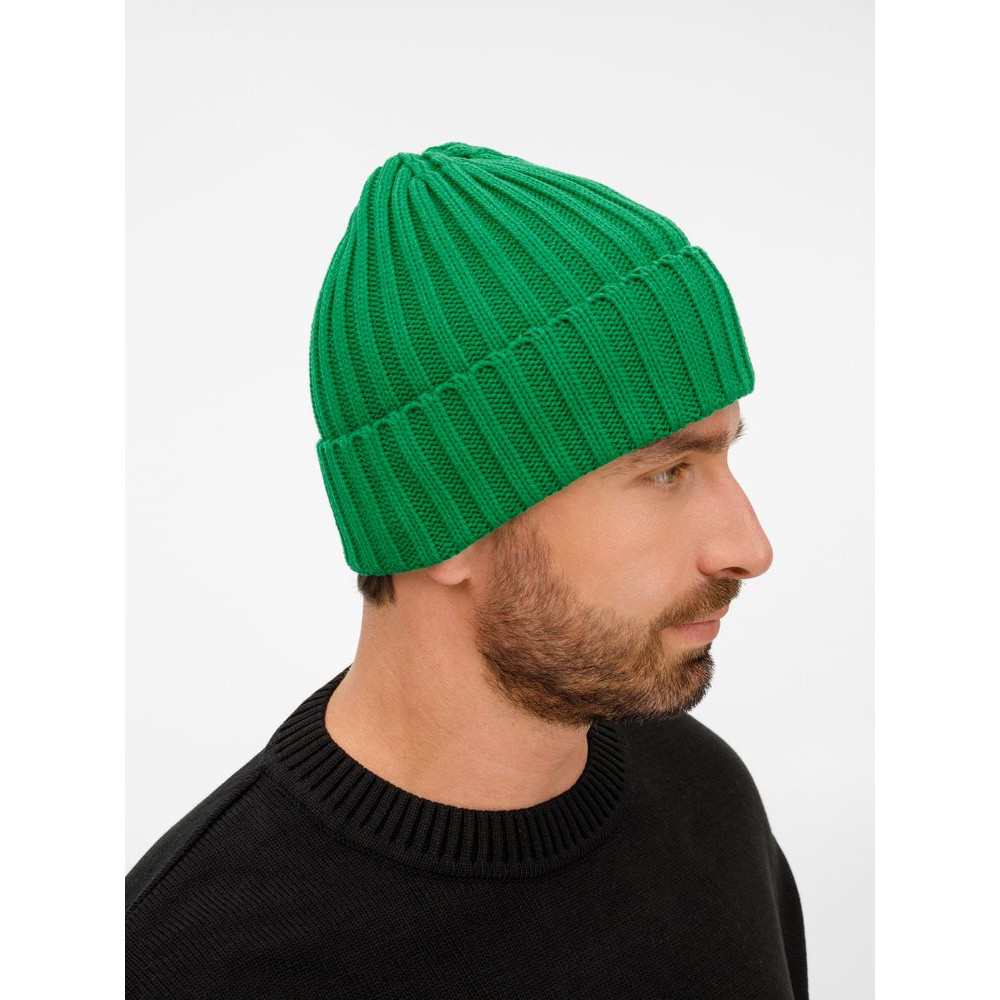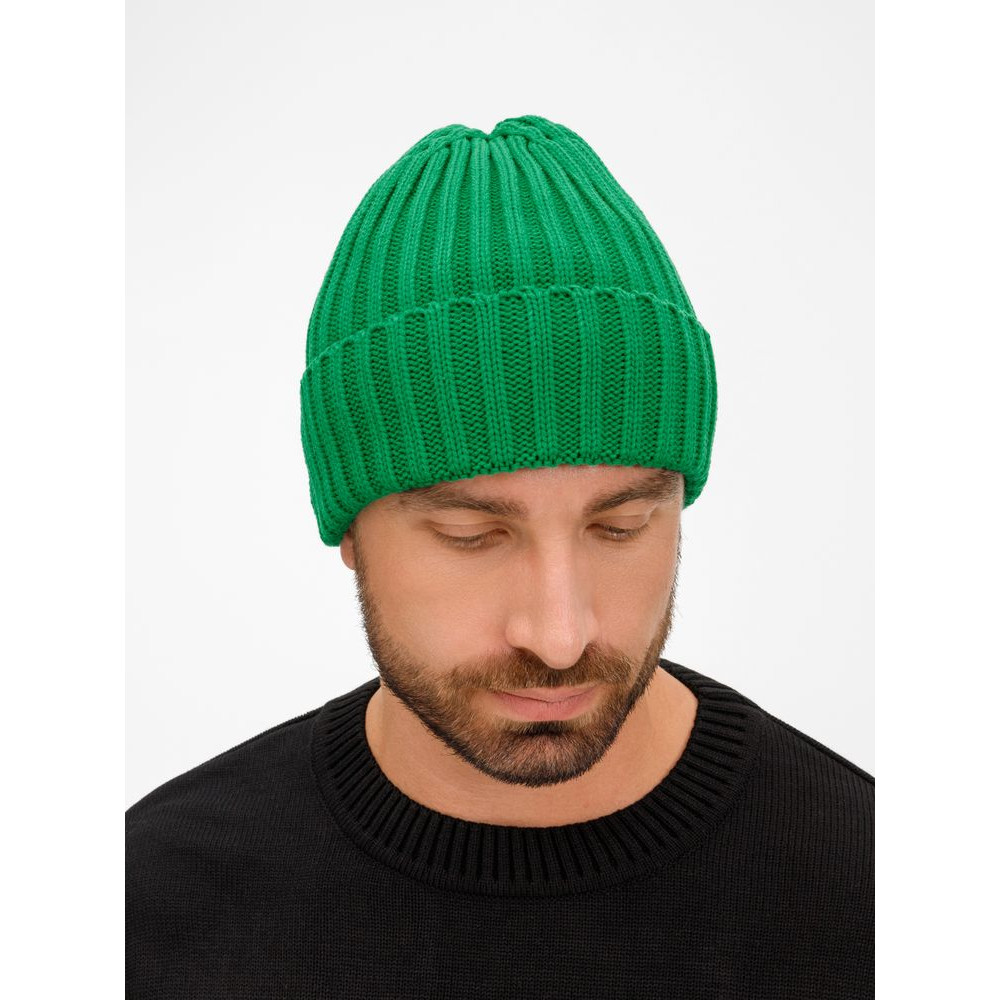 Однослойная шапка рельефной вязки с отворотом.