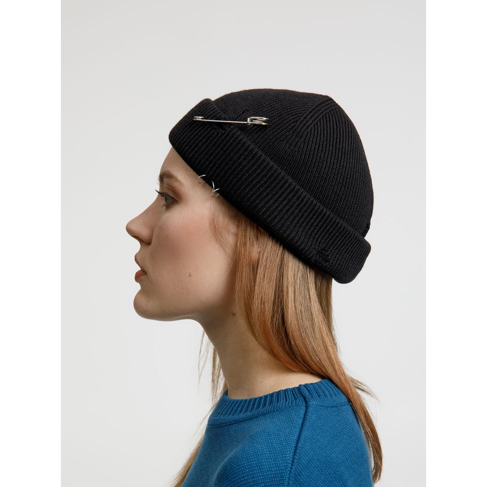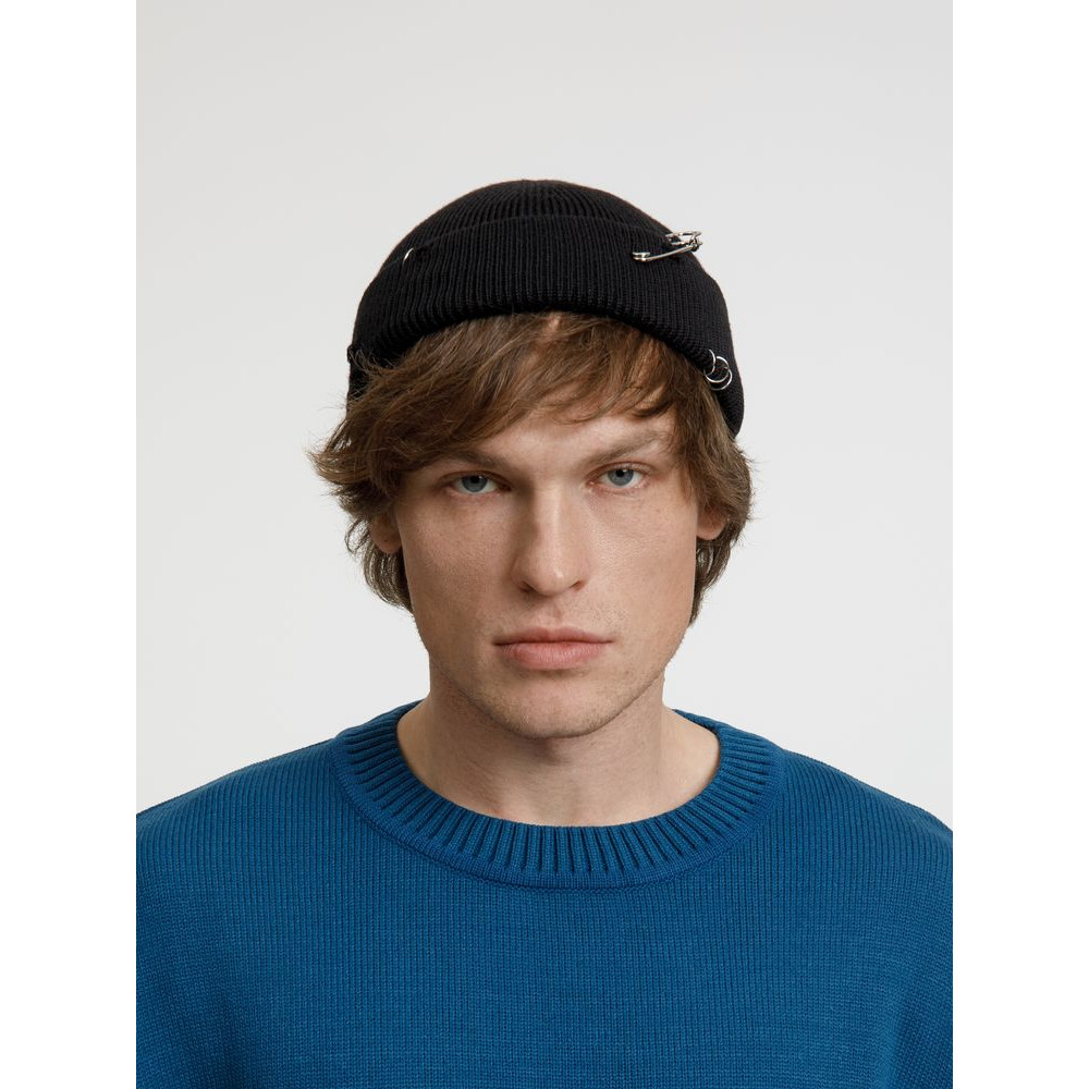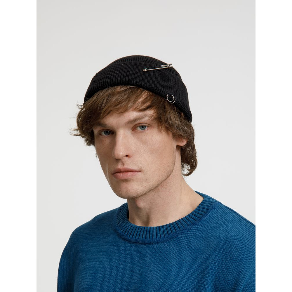 Однослойная шапка бини с рваным отворотом и металлическими аксессуарами для дерзких образов в любом возрасте. Яркий и запоминающийся акцент в стиле гранж.